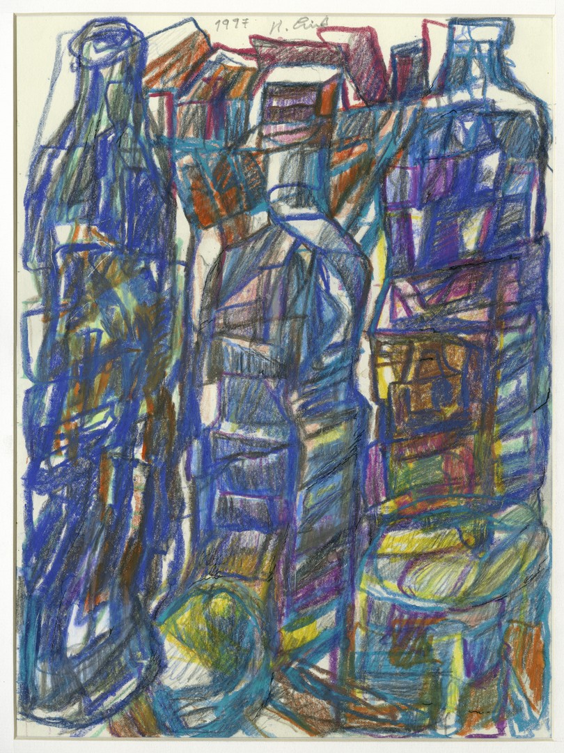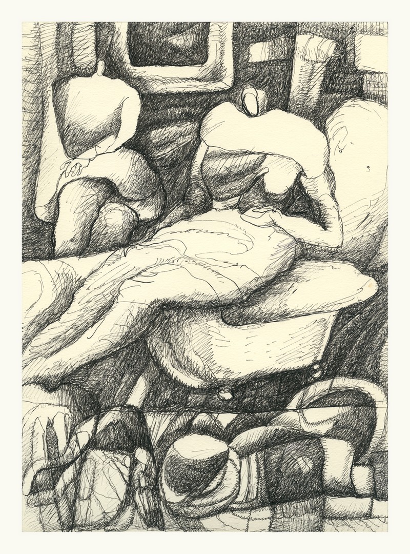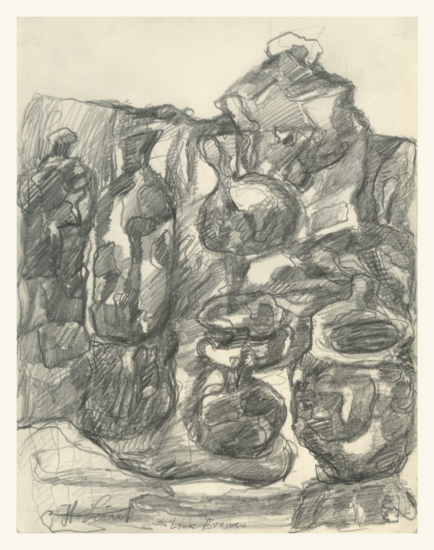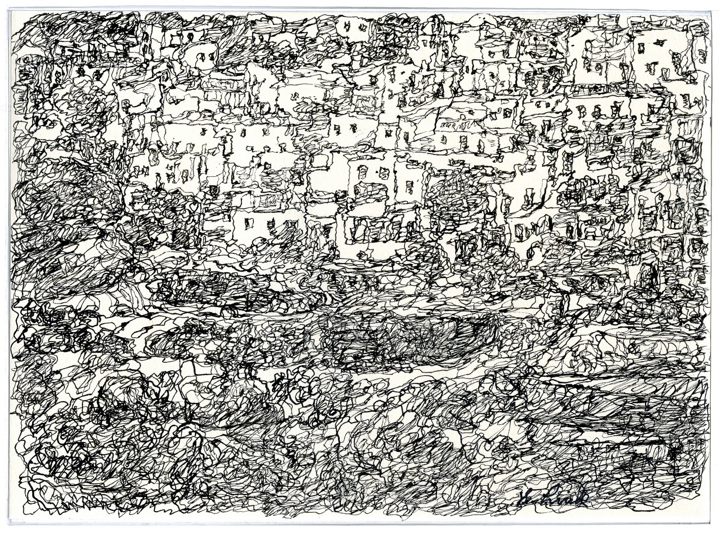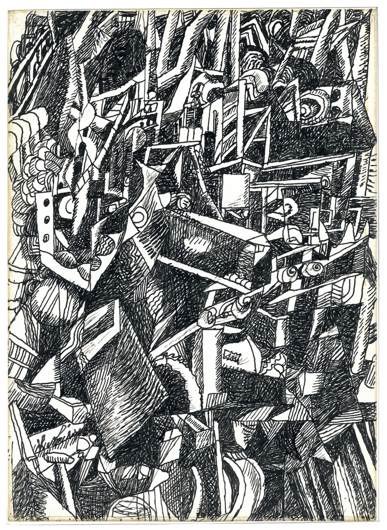 Dann können, vielleicht entsprechend der wesentlichen Struktur der Motive, aus dem Lineament kleinere Formen herauskristallisiert werden, die mit einer autonomen, vom Motiv unabhängigen Strichstruktur aufgefüllt werden. So entstehen große Gruppen kleiner Formen und Differenzierungen in den Grauwerten, jedoch in einer sehr gemäßigten Weise, die ein völlig anderes Bild ergeben als die früheren mit Hell- und Dunkel-Kontrasten versehenen Zeichnungen.